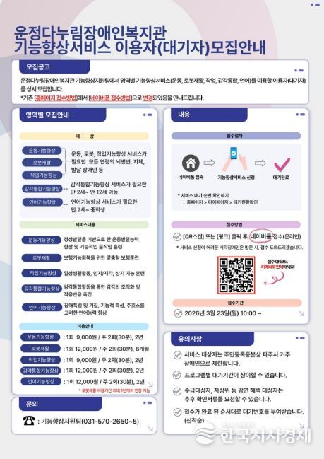 한국시사경제 경기북부취재본부 | 파주시 운정다누림장애인복지관은 지역 내 장애인의 기능 향상과 일상생활 능력 증진을 위해 ‘기능향상서비스’참여자를 오는 23일부터 상시 모집한다.