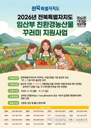 한국시사경제 문화팀 | 전북특별자치도가 임산부의 건강 증진과 친환경 농산물 소비 확대를 위해‘임산부 친환경농산물 꾸러미 지원사업’신청을 오는 3월 23일부터 4월 17일까지 모집한다고 19일 밝혔다.