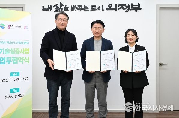 한국시사경제 경기북부취재본부 | 의정부시는 3월 17일 시청 시장실에서 지역 스타트업 ㈜강단스튜디오, 경기콘텐츠진흥원과 기술실증(PoC) 사업 업무협약을 체결하고, 스타트업 지원과 공공 혁신을 위한 협력 체계 구축에 나섰다.