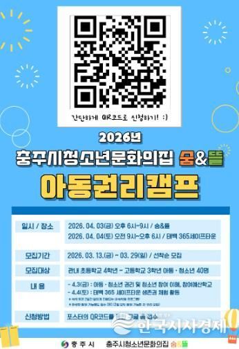 한국시사경제 충북취재본부 | 충주시청소년문화의집 숨&뜰은 오는 4월 3일부터 4일까지 아동 권리 보장을 위한‘2026년 아동권리캠프 프로그램’을 진행한다.