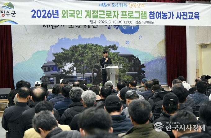 한국시사경제 전북취재본부 | 장수군은 18일 군청 군민회관에서 2026년도 외국인 계절근로자 고용농가 190명을 대상으로 사전교육을 실시했다.