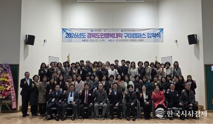 한국시사경제 경북취재본부 | 구미시는 19일 국립금오공과대학교 평생교육원 실내체육관에서 신입생 55명과 총동창회 회원 등 70여 명이 참석한 가운데 ‘2026년 제6기 도민행복대학 구미캠퍼스 명예학사과정 입학식’을 개최했다.