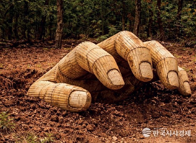 땅에서 솟아오르는 거대한 대나무 손은 인간의 고된 노동이 숭고한 생명 지탱의 몸짓으로 승화되는 상호성의 제스처를 상징하며, 대지가 살아있는 변형의 주체임을 시사한다.