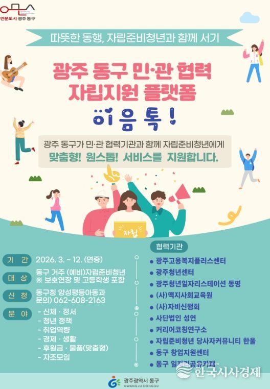 한국시사경제 문화팀 | 광주 동구는 보호 종료 5년 이내 자립 준비 청년을 대상으로 민·관 협력 자립지원 플랫폼 ‘이음톡!’ 사업을 지난해에 이어 2026년에도 지속 추진한다고 밝혔다.