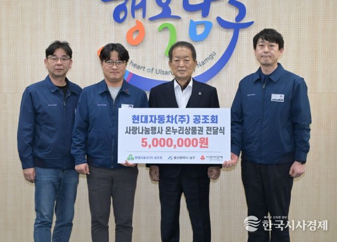 한국시사경제 울산취재본부 | 상부상조의 정신으로 꾸준한 나눔을 이어가는 현대자동차(주) 공조회(회장 박상옥)는 23일 남구청을 방문해 관내 저소득층 지원을 위한 500만 원 상당의 온누리상품권을 전달했다.