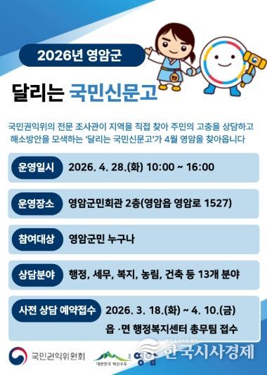 이번 국민신문고는 4월 28일 오전 10시부터 오후 4시까지 영암군민회관에서 열린다. 국민권익위원회 전문 조사관이 직접 현장을 찾아 행정·복지뿐 아니라 생활법률, 서민금융, 소비자 피해구제 등 다양한 분야의 민원을 상담한다.