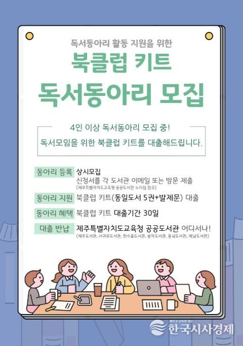 한국시사경제 노승선 기자 | 제주도교육청 제주도서관은 24일부터 다양한 독서동아리를 발굴하고 지역 내 독서모임을 활성화하기 위해 ‘독서동아리 활동 지원을 위한 북클럽 키트’ 서비스를 제주특별자치도교육청 소속 6개 공공도서관에서 동시에 운영한다고 밝혔다.