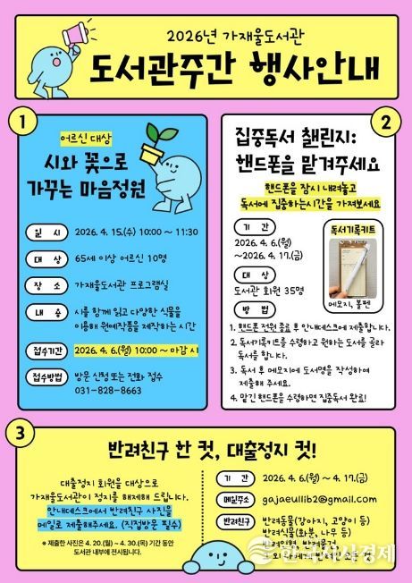 이 외에도 대출정지 회원을 위한 이벤트 ‘반려친구 한 컷, 대출정지 컷!’도 진행한다. 반려친구 사진을 이메일로 제출하면 대출정지를 해제하는 행사로, 반려친구의 범위는 반려동물뿐만 아니라 반려식물, 반려인형, 반려물건 등 개인에게 의미 있는 대상까지 폭넓게 포함한다. 자세한 사항은 도서관 누리집을 참고하거나 가재울도서관(031-828-8663)으로 문의하면 안내받을 수 있다.