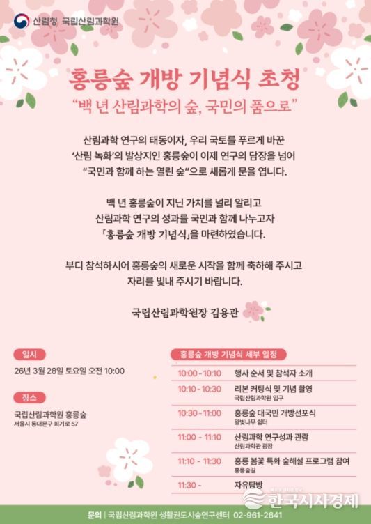 이번 행사는 대한민국 산림과학 연구의 요람이자 100년 역사를 품은 연구시험림인 홍릉숲이 국민과 함께하는 공간으로 거듭나는 새로운 출발을 기념하기 위해 마련됐다. 국립산림과학원은 이번 개방에 맞춰, 숲의 생태적·학술적 가치를 상징하는 ‘홍릉 8경’을 선정해 시민들에게 처음 공개한다.