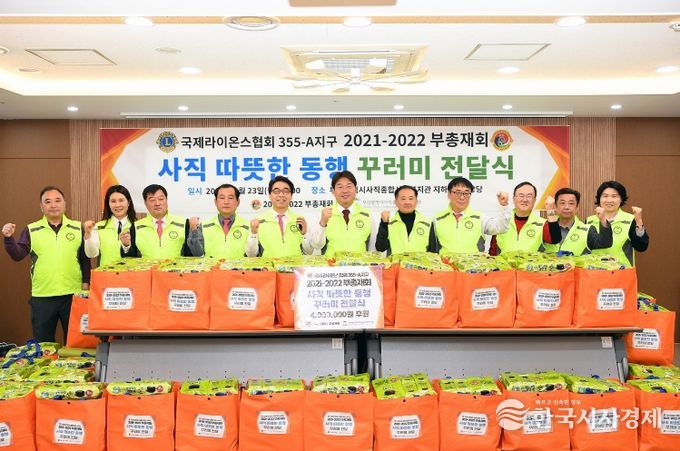 한국시사경제 부산취재본부 | 부산 동래구는 지난 23일 국제라이온스협회 355-A(부산)지구 2021-2022 부총재회(회장 맹성재)가 사직종합사회복지관에 동래구 취약계층을 위한 400만 원 상당의 ‘사직 따뜻한 동행 꾸러미’ 80상자를 기탁했다고 밝혔다.
