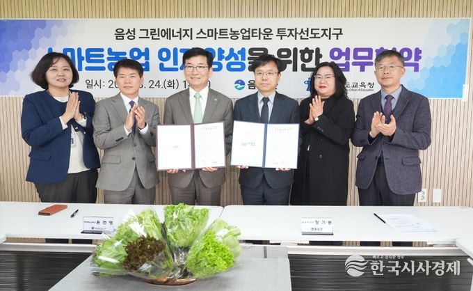 한국시사경제 오영주 기자 | 음성군은 24일 H&A 스마트팜과 그린에너지 스마트농업타운 대상지 일원에서 충청북도교육청과 함께 지역 교육발전 방향과 미래 인재 양성 협력방안을 모색하기 위한 정책간담회를 열고 공동협약을 체결했다.