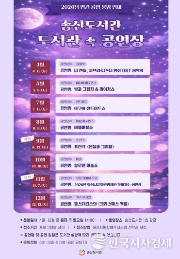 한국시사경제 이정이 기자 | 화성시문화관광재단 송산도서관은 오는 4월부터 12월까지 지역 주민들에게 풍요로운 문화 체험의 기회를 제공하는 연간 상설 공연 프로그램 '도서관 속 공연장'을 운영한다.