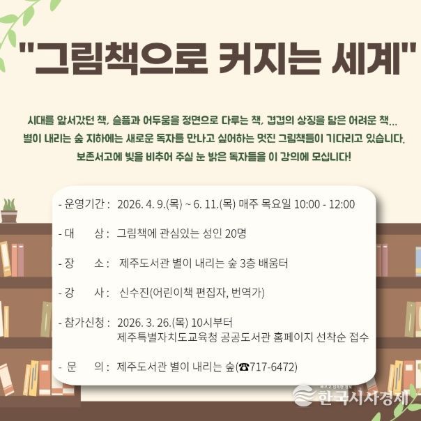 한국시사경제 노승선 기자 | 제주도교육청 제주도서관은 4월 9일부터 6월 11일까지 자료실 보존서고에 소장된 그림책을 재조명하고 지역주민에게 깊이 있는 독서 경험을 제공하기 위해 ‘그림책으로 커지는 세계’ 참가자를 모집한다.