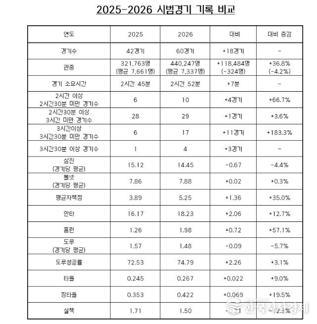 한국시사경제 스포츠팀 | 3월 24일(화) 막을 내린 2026 KBO 시범경기는 60경기에 총 44만 247명의 관중이 입장해 역대 시범경기 단일시즌 최다 관중 기록을 경신했다. 종전 기록은 2025년에 기록한 32만 1,763명이었다.