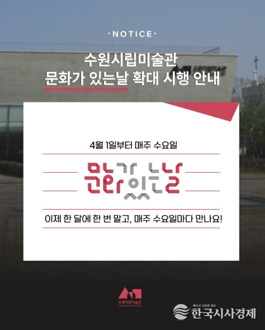 한국시사경제 사회팀 | 경기도 수원시립미술관은 4월 1일부터 ‘문화가 있는 날’ 운영을 기존 매월 마지막 주 수요일 1회에서 매주 수요일로 확대 운영한다.