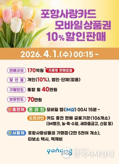 한국시사경제 경제팀 | 포항시가 지역 경제에 활력을 불어넣기 위해 내달 1일부터 카드형·모바일 포항사랑상품권(포항사랑카드) 170억 원을 10% 할인된 금액으로 판매한다.