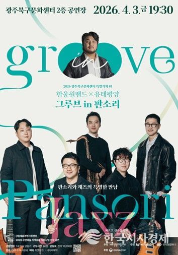 한국시사경제 광주취재본부 | 동서양 음악의 경계를 허무는 가장 완벽하고 파격적인 크로스오버 무대가 광주 북구를 찾아온다. 북구문화센터는 오는 4월 3일 오후 7시 30분, 대한민국 최정상 재즈 뮤지션들로 구성된 ‘한웅원밴드’와 ‘국악 신동’ 출신의 젊은 소리꾼 ‘유태평양’이 함께하는 국악 크로스오버 기획공연 '그루브 in 판소리'를 개최한다고 밝혔다.