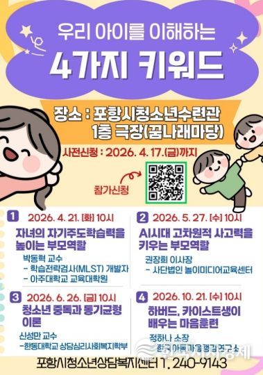 한국시사경제 문화팀 | 포항시청소년재단 청소년상담복지센터는 올해 운영할 부모교육 주제를 ‘우리 아이를 이해하는 4가지 키워드’로 확정하고 오는 17일까지 참가자를 모집한다.