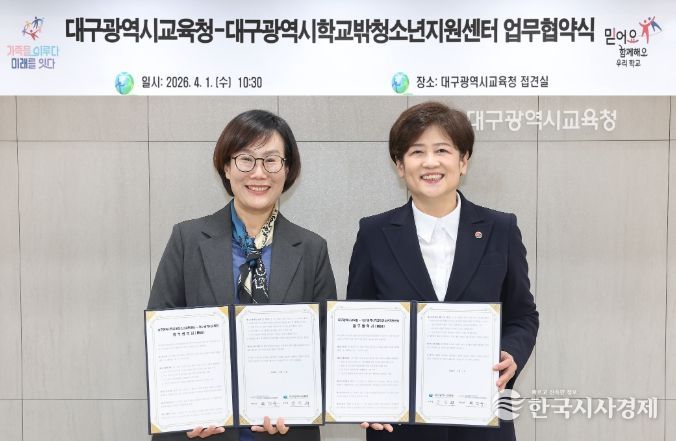 한국시사경제 대구취재본부 | 대구시교육청은 4월 1일 시교육청 접견실에서 대구학교밖청소년지원센터(센터장 최미송)와 ‘학교 밖 청소년 지원을 위한 업무협약’을 체결했다.