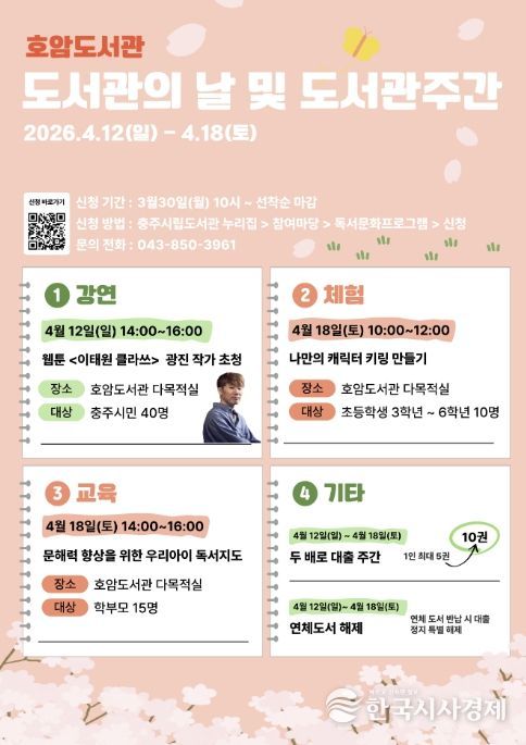 한국시사경제 충북취재본부 | 충주시 호암도서관은 제4회 ‘도서관의 날’과 제62회 ‘도서관주간’을 맞아 4월 12일부터 18일까지 7일간 다채로운 독서문화 행사를 운영한다고 2일 밝혔다.
