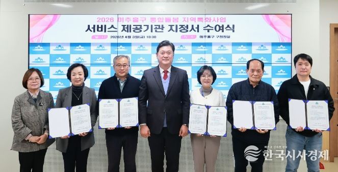한국시사경제 문화팀 | 인천 미추홀구는 3일 구청장실에서 ‘2026년 미추홀구 통합 돌봄 지역특화 사업을 수행할 서비스 제공기관 5곳에 지정서를 수여했다고 밝혔다.