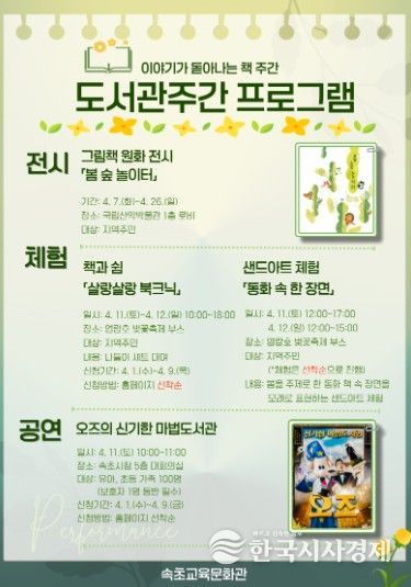 마술과 놀이를 통해 책의 재미와 가치를 체험할 수 있는 공연 ‘오즈의 신기한 마법도서관’은 4월 11일 오전 10시부터 11시까지 속초시청 대강당에서 열린다. 해당 공연도 누리집을 통해 선착순으로 접수받을 예정이다.