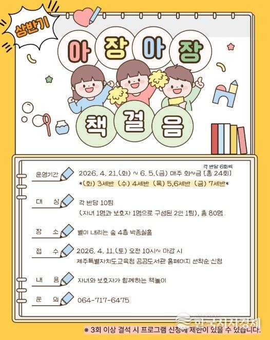 한국시사경제 노승선 기자 | 제주도교육청 제주도서관은 21일부터 6월 5일까지 영유아의 언어 발달과 올바른 독서 습관 형성을 지원하고 가정 중심의 독서 문화를 확산하기 위해 2026년 상반기 프로그램 ‘아장아장 책걸음’을 운영한다.