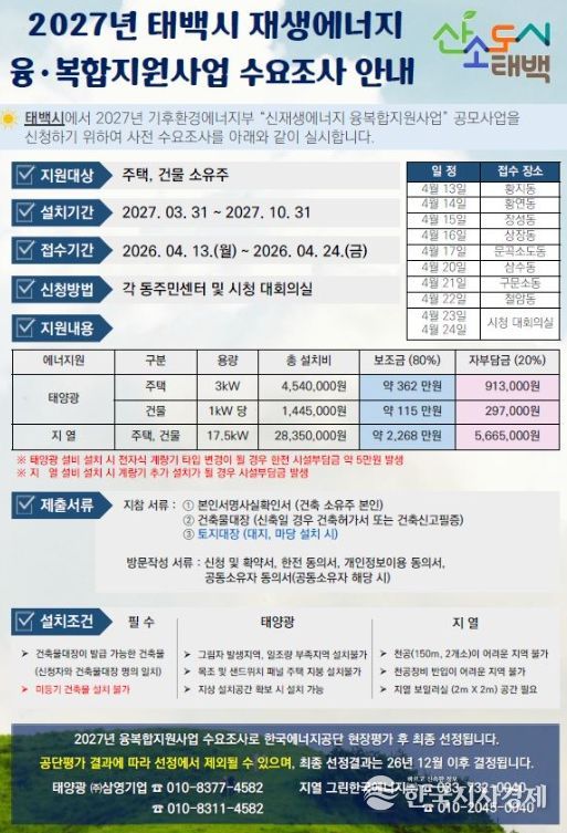 한국시사경제 권충언 기자 | 태백시는 재생에너지(태양광, 지열) 설치를 지원하는 공모사업인 ‘2027년 태백시 재생에너지 융복합지원 사업’ 추진을 위해 오는 5월 13일까지 수요조사를 실시한다고 밝혔다.