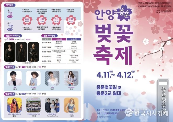 한국시사경제 기동취재팀 | 안양시는 오는 4월 11일부터 12일까지 이틀간 만안구 충훈동 충훈벚꽃길과 충훈2교 하부, 석수로 일대에서 ‘2026 안양충훈벚꽃축제’를 개최한다고 8일 밝혔다.