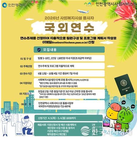 한국시사경제 문화팀 | 인천시사회서비스원은 인천 사회복지시설 종사자를 대상으로 국외연수지원사업 참여자를 모집한다고 9일 밝혔다.