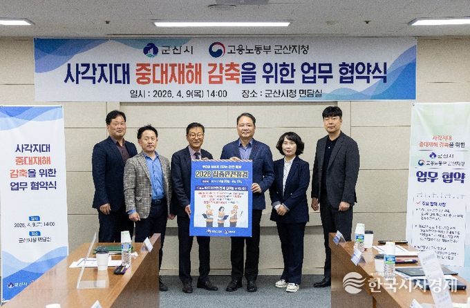 시는 9일 군산시청에서 고용노동부 군산지청과 ‘사각지대 중대재해 감축을 위한 업무협약’을 체결했다고 밝혔다. 이날 협약식에는 김영민 군산시장 권한대행과 김재훈 고용노동부 군산지청장을 비롯한 양 기관 관계자들이 참석했다.