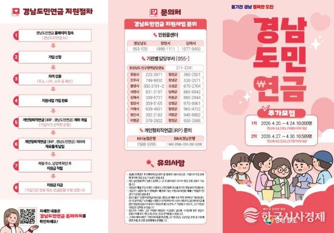 남해군 관계자는 “이번 추가모집은 조기 마감으로 참여하지 못한 군민들에게 신청 기회를 다시 제공하기 위한 것”이라며, “경남도민연금은 소득 공백기 대비를 위한 제도인 만큼 대상 군민들께서는 모집 일정에 맞춰 신청해 주시기 바란다”고 밝혔다.