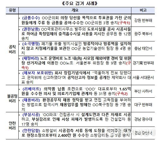 분야별 현황은 ① 공직비리 사범 998명(구속 36명) ② 불공정비리 사범 462명(구속 18명) ③안전비리 사범 537명(구속 2명)으로 나타났다.