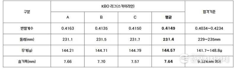 이번 검사는 KBO 리그 단일 경기사용구인 ㈜스카이라인스포츠 AAK-100의 샘플 3타를 무작위로 수거한 뒤 지난 26일(금)부터 29일(월)까지 국민체육진흥공단(KSPO) 한국스포츠개발원 스포츠용품 시험소에 의뢰해 진행했다. 검사 결과, 모든 샘플이 합격기준을 충족한 것으로 확인됐다.