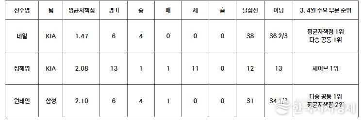 투수 KIA 네일, 정해영, 삼성 원태인 등 3명