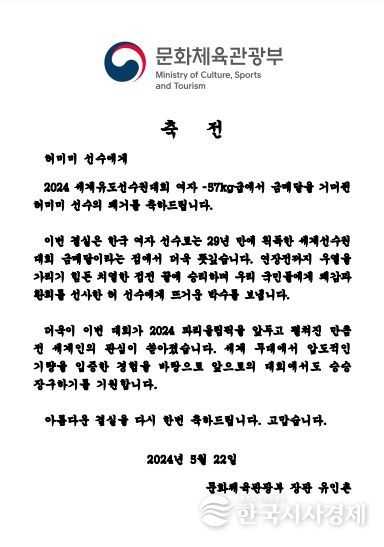 한국시사경제 스포츠팀 | 문화체육관광부 유인촌 장관은 아랍에미리트 아부다비에서 열린 ‘2024 세계유도선수권대회(5. 19.~24.)’ 여자 -57kg급에서 금메달을 획득한 허미미 선수에게 축전을 보내 축하와 격려의 뜻을 전했다.
