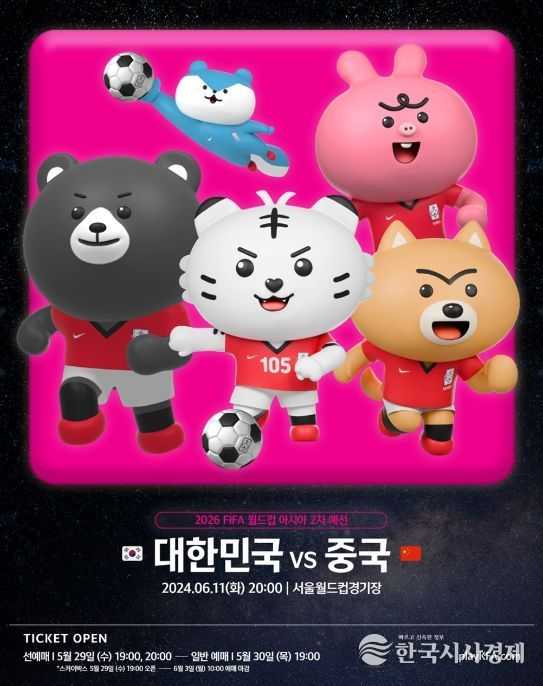 한국시사경제 스포츠팀 | 대한축구협회가 북중미 월드컵 아시아 2차 예선 중국과의 홈경기 티켓을 29일부터 순차적으로 판매한다. 경기는 6월 11일 화요일 저녁 8시 서울월드컵경기장에서 열린다.