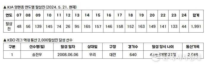 한편 양현종은 KBO 리그 개인 최다 탈삼진 기록에도 근접했다. 현재 기록을 보유하고 있는 송진우의2,048개에도 57개 차로 근접해 이번 시즌 대기록 경신이 가능하다. 또한 2014 시즌부터 2023시즌까지 9시즌 연속 세자릿 수 탈삼진을 기록한 양현종은 탈삼진 56개를 추가하면 전 해태 이강철, 전 두산 장원준과 함께 10시즌 연속 세자릿 수 탈삼진으로 이 부문 연속 기록 최다 타이를 이루게 된다.