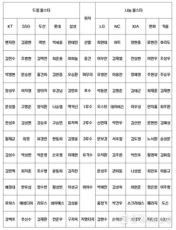 명단은 해당 구단에서 추천한 포지션별 1명씩(투수는 선발, 중간, 마무리 각각 1명씩 총 3명)의 선수로 구성돼 구단 당 12명, 총 120명의 선수가 후보에 올랐다.