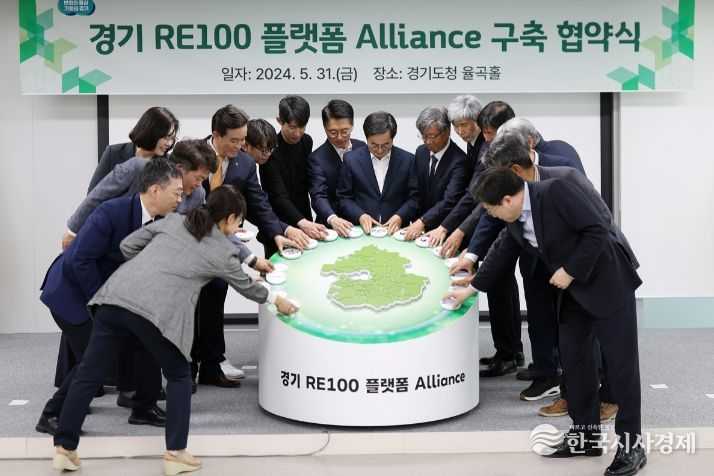 김동연 경기도지사는 31일 오전 경기도청에서 공공기관인 국토지리정보원, 국립산림과학원, 국립생태원, 한국건설기술연구원, 한국교통연구원, 한국에너지공단, 한국환경연구원, 민간기업인 카카오모빌리티, SK텔레콤, 네이버 클라우드와 함께 이런 내용을 담은 ‘경기 RE100 플랫폼 얼라이언스(Alliance) 구축 업무협약’을 체결했다. 경기도에서는 경기연구원과 GH, 경기환경에너지진흥원, 경기창조경제혁신센터, 차세대융합기술원이 함께 했다.