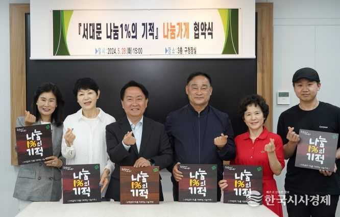 한국시사경제 경제팀 | 서대문구는 최근 구청장실에서 충현동상가번영회(12개 업소), 8호점 ㈜디자인글로리아(홍제3동), 35호점 린나이서대문대리점(연희동), 36호점 홍제안경콘택트(홍제3동), 39호점 신진전기조명(홍은2동), 49호점 칠구네신림동백순대(홍은2동)와 ‘서대문 나눔1%의 기적’ 협약을 체결했다고 31일 밝혔다.