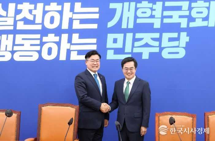 한국시사경제 경기취재본부 | 김동연 경기도지사가 박찬대 더불어민주당 원내대표를 만나 경기도 주요 입법과제인 ‘경제 3법’ 제·개정 협조를 재차 강조했다. 김동연 지사는 지난 5월 24일 제22대 국회 경기도 지역구 당선인 40명을 만난 자리에서도 ‘경제 3법’에 힘을 모아달라고 요청한 바 있다.