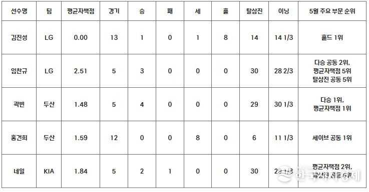 두산 곽빈은 등판한 5경기에서 4승을 달성하며 다승 부문 1위를 차지했다. 특히 3경기에서 19이닝을 던지는 동안 자책점을 허용하지 않아 평균자책점도 1.48로 단독 1위에 올랐다. 곽빈은 두산이 5월 한 달 동안 구간 성적 1위를 달릴 수 있는 상승세를 주도했다.