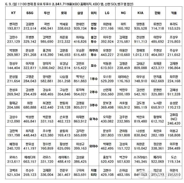 가장 각축인 부문은 외야수 한 자리다. KIA 소크라테스가 74만 5,345표로 3위를 달리고 있는 가운데, 키움 도슨이 71만 9,134표로 2만 6,211표 차이로 바짝 뒤쫓고 있다.