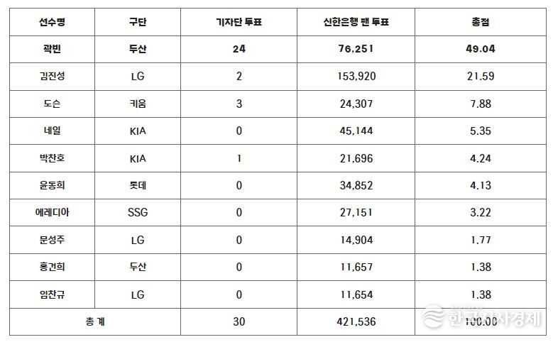 기자단 투표 총 30표 중 24표(80%), 팬 투표 42만 1,536표 중 7만, 6,251표(18.1%)로 총점 49.04점을 받은 두산 곽빈은 기자단 투표 2표, 팬 투표 15만 3,920표로 총점 21.59점을 기록한 2위 LG 김진성을 제치고 5월 월간 MVP로 선정됐다.
