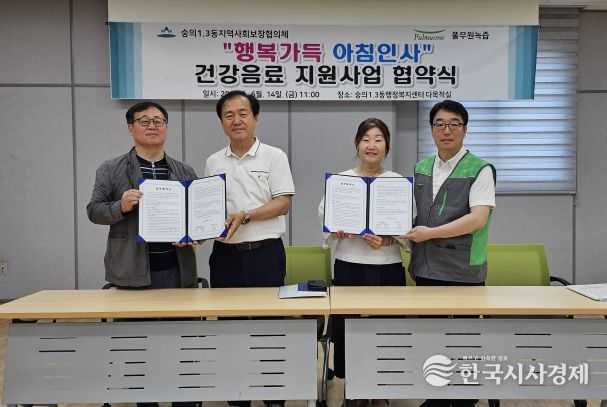 한국시사경제 경제팀 | 미추홀구 숭의1·3동 지역사회보장협의체는 14일 풀무원녹즙과 ‘행복 가득 아침 인사 건강음료 지원사업’ 협약을 체결했다.