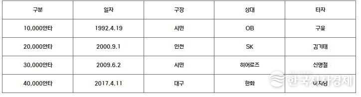 이만수가 1982년 한국 프로야구 역사 상 첫 안타 이자, 삼성의 첫 안타를 기록하며 역사는 시작됐다. 이후 10년 만인 1992년 1만 안타를 기록했고, 2000년 2만 안타를 돌파해 2009년 3만 안타, 2017년 4만 안타까지 달성했다.