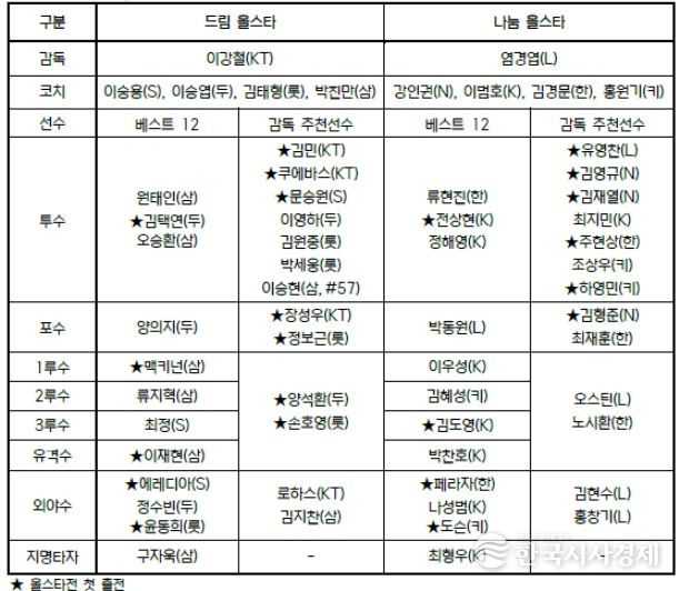 드림 올스타에서는 베테랑 선수들의 첫 출전이 눈에 띈다. KT 장성우는 데뷔 후 17년 만, 두산 양석환은 데뷔 11년 만에 처음으로 올스타에 선정되는 감격을 맛보았다.