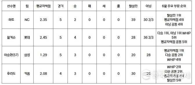 이번 시즌을 앞두고 선발로 전환한 삼성 이승현은 보직이동 후 가장 좋은 한 달을 보냈다. 5경기에 등판해 28이닝 동안 4자책점만을 기록하며 평균자책점 1.29로 이 부문 1위에 올랐다. 또한 이번 시즌 월별 기록에서 처음으로 평균 5이닝 이상을 던지며 이닝 소화력을 점점 끌어올리고 있다. 이승현이 6월의 활약을 계속해서 이어나간다면 삼성은 든든한 국내 선발 에이스를 한 명 더 얻게 된다.