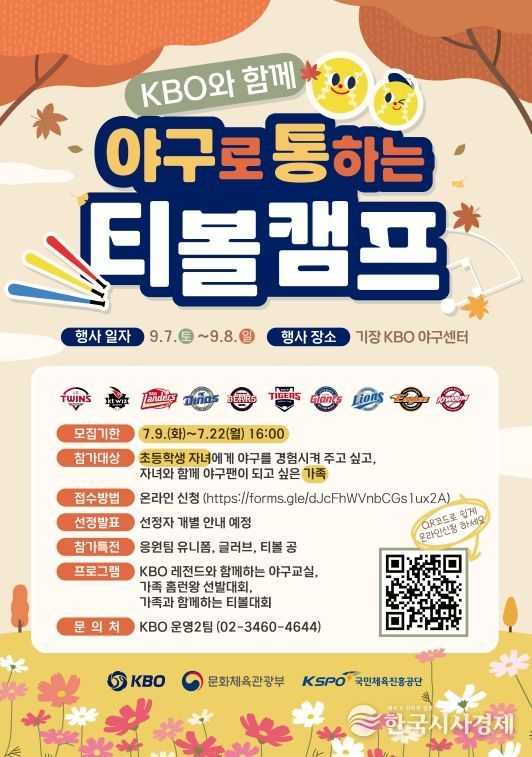 한국시사경제 스포츠팀 | KBO는 ‘제 2차 2024 야구로 통하는 티볼캠프’에 참가할 가족을 오늘(9일)부터 22일(월) 오후 4시까지 모집한다.